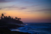 Na zdjęciu wschód słońca w górach na tle Oceanu Atlantyckiego. Słońce zachodzi za górą i chowa się w chmurach. Woda oceaniczna odzwierciedla blask wschodzącego słońca.
