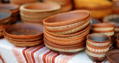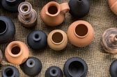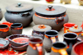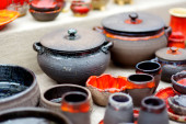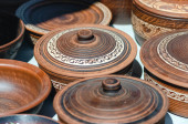 Wielokolorowe gliniane dzbany. Narodowa garncarstwo. Przyjazne dla środowiska naczynia ceramiczne. Kontekst przedmiotów.