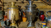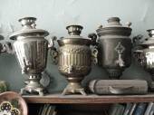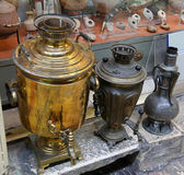 Stare, tradycyjne samowar na ceremonię herbaty. Rustykalny pomysł. Kontekst przedmiotów.