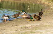 Kaczki szukają pożywienia na jeziorze w parku zimą