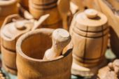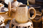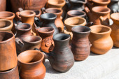 Rustykalny gliniany kubek. Narodowa garncarstwo. Przyjazne dla środowiska naczynia ceramiczne. Kontekst przedmiotów.