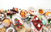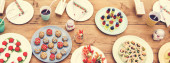 Zabawa Wielkanocne śniadanie lub brunch tabeli sceny. Powyżej widok na tle ciemnego drewna baner. Naleśnik Bunny, gniazda jaj, owoce piskląt i wybór wiosennych produktów spożywczych.