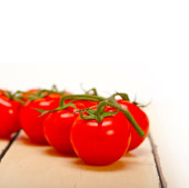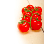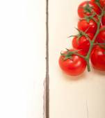 świeże pomidory wiśniowe na klastrze nad wiejskim drewnianym stołem