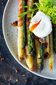 Domowej roboty świeży chleb z ziołami (pietruszka, tymianek, rozmaryn, koperek), czosnek, ser i pikantne masło na drewnianej desce.