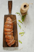 Zdjęcie "Domowej roboty świeży chleb z ziołami (pietruszka, tymianek, rozmaryn, koperek), czosnek, ser i pikantne masło na drewnianej desce." może być wykorzystywane do celów osobistych i komercyjnych zgodnie z warunkami zakupionej licencji Royalty-free. Obraz jest dostępny do pobrania w jakości wysokiej rozdzielczości do 5760x3840.