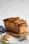 Domowej roboty świeży chleb z ziołami (pietruszka, tymianek, rozmaryn, koperek), czosnek, ser i pikantne masło na drewnianej desce.