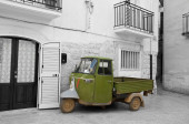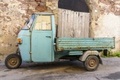 Piaggio Ape, lekki pojazd trzykołowy.Piaggio małpa otwarta furgonetka zaparkowała włoską piazza.Piaggio Ape, trzykołowy lekki samochód dostawczy. Włochy.Ape Car - trzykołowy lekki samochód dostawczy.Ape, trzykołowy samochód dostawczy.
