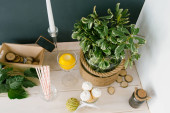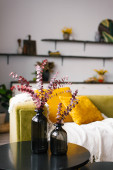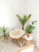Wewnętrzna palma w garnku we wnętrzu salonu w ciepłych kolorach
