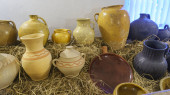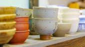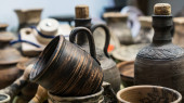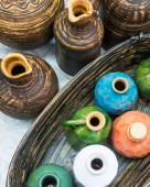 Zestaw glinianych kubków w herbaciarni. Sklep z tradycyjnymi naczyniami do herbaty. Kontekst przedmiotów.