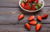 Dużo dojrzałych czerwonych truskawek w białej talerzu na drewnianym stole. Widok z góry. Kontekst żywności.