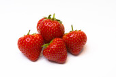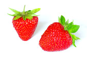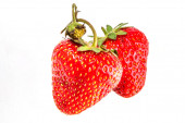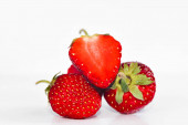 Widok z góry czerwona truskawka i dwa mokre czereśnie na białym tle. Miejsce na tekst. Koncepcja. Kontekst żywności.