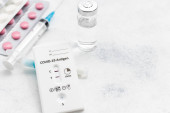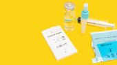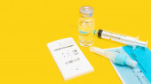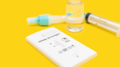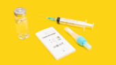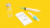 Zestaw do szybkiego testu na obecność antygenu w chorobie wirusowej COVID-19 z wynikiem ujemnym, żółte tło z miejscem do kopiowania.