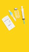 Zestaw szybkiego testu na obecność antygenu w chorobie wirusowej COVID-19 z wynikiem dodatnim, żółte tło z przestrzenią do kopiowania.