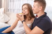 Zdjęcie "Słodka młoda para lubi jeść razem lunch, żartobliwie karmią się pizzą. Randka w domu. Cudowne chwile. Miłosne związki. Romans w życiu." może być wykorzystywane do celów osobistych i komercyjnych zgodnie z warunkami zakupionej licencji Royalty-free. Obraz jest dostępny do pobrania w jakości wysokiej rozdzielczości do 5760x3840.