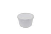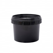 Czarne plastikowe naczynia. głęboka zupa na białym tle