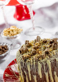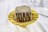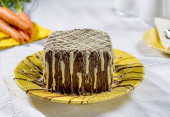 Ciasto marchewkowe pokryte czekoladą, na żółtym talerzu w czystym otoczeniu