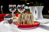 Ciasto marchewkowe pokryte czekoladą, na żółtym talerzu w czystym otoczeniu