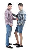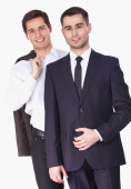 dwóch mężczyzn biznesowych posiadających umowy folderu na białym tle