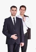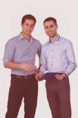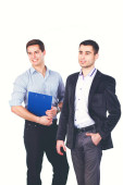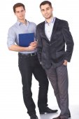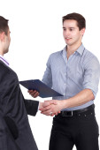 dwóch mężczyzn biznesowych posiadających umowy folderu na białym tle