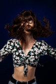 Piękna młoda dziewczyna pozująca w studio na ciemnoniebieskim tle. Włosy w powietrzu.