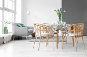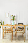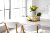 Wazon z pięknymi kwiatami tulipanów na stole jadalnym w pokoju