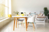 Wazon z pięknym kwiatem Gerbera na stole jadalnym, wygodne puf i roślin domowych w pokoju