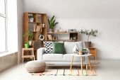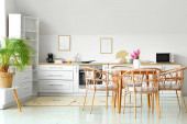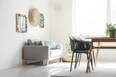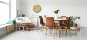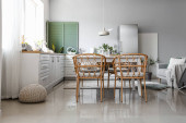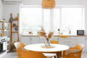 Zdjęcie "Wazon z pięknym kwiatem Gerbera na stole jadalnym, wygodne puf i roślin domowych w pokoju" może być wykorzystywane do celów osobistych i komercyjnych zgodnie z warunkami zakupionej licencji Royalty-free. Obraz jest dostępny do pobrania w jakości wysokiej rozdzielczości do 5760x3840.