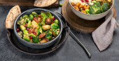 Sałatka brukselka kiełkować z bulgur na ciemnym tle. Wegańskie cocnept żywności. Widok z góry, płaski, przestrzeń do kopiowania