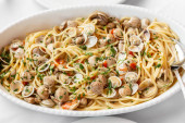 Pyszny makaron z jedzeniem morskim na stole, zbliżenie