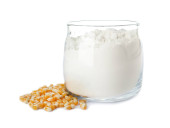 Szklanka świeżego mleka sojowego i fasoli na białym tle
