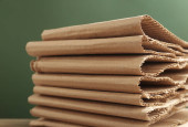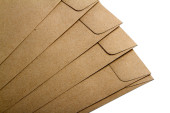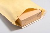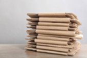 Stos dużych kopert papierowych kraft na lekkim stole, zbliżenie