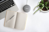 Zdjęcie "Inteligentna kolumna głośnikowa Yandex stacji kolor fuksji i notatnik z ołówkiem na biurku. Mini Przenośny bezprzewodowy głośnik głosowy Bluetooth. Moskwa, Rosja - 02.01.2022" może być wykorzystywane do celów osobistych i komercyjnych zgodnie z warunkami zakupionej licencji Royalty-free. Obraz jest dostępny do pobrania w jakości wysokiej rozdzielczości do 5760x3840.
