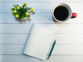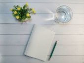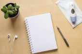 Inteligentna kolumna głośnikowa Yandex stacji kolor fuksji i notatnik z ołówkiem na biurku. Mini Przenośny bezprzewodowy głośnik głosowy Bluetooth. Moskwa, Rosja - 02.01.2022