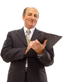 Dojrzały mężczyzna rozmawiający przez komórkę uśmiechnięty do kamery