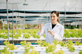Młoda kobieta w okularach, rękawiczkach i ubraniu roboczym dotykająca zielonych sadzonek