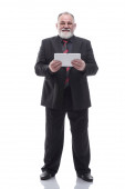 Przystojny, dojrzały biznesmen w formalnym garniturze używa tabletu cyfrowego, patrzy w kamerę i uśmiecha się