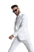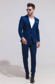 pełne ciało zdjęcie fajnego człowieka garnitur zapinanie i pozowanie w świetle mody stojąc odizolowany na białym tle w studio