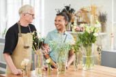 Młody kierownik kwiaciarni lub oranżerii rozmawiający z pracownicą