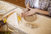 Nierozpoznawalne dziecko nakładające znaczki na gliniany kubek w warsztacie garncarskim