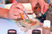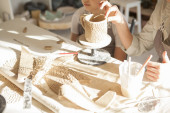 Nierozpoznawalne dziecko zdobiące ceramikę znaczkami, pomagające matce na lekcji garncarstwa