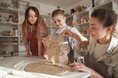 Zdjęcie "Profesjonalny garncarz nauczania młodej kobiety z dzieckiem rzucając garnek na koło ceramiki" może być wykorzystywane do celów osobistych i komercyjnych zgodnie z warunkami zakupionej licencji Royalty-free. Obraz jest dostępny do pobrania w jakości wysokiej rozdzielczości do 5760x3840.