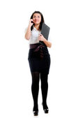 Portret wesołej bizneswoman w garniturze trzymając zabrać filiżankę kawy podczas rozmowy przez telefon komórkowy