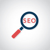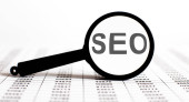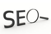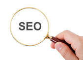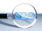 Szkło powiększające z tekstem SEO na drewnianym stole.