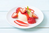Biała panna cotta z truskawką w naczyniu na białym tle. Widok z góry