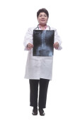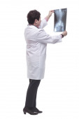 Widok z przodu kobiety lekarza noszącej stetoskop i okulary patrzące na prześwietlenie