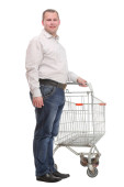 Zdjęcie przystojnego uśmiechniętego mężczyzny w garniturze z torbami na zakupy