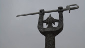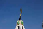 Sukabumi, Jawa Zachodnia, Indonezja - 22 września 2020: Pomnik dłoni trzymającej książkę i lotos na placu Sukabumi w pochmurny dzień.