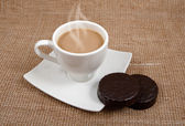 Obraz filiżanki herbaty z kości słoniowej z ciasteczkiem w kształcie serca.