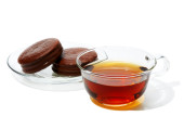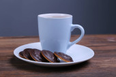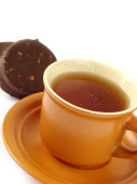 Obraz filiżanki herbaty z kości słoniowej z ciasteczkiem w kształcie serca.