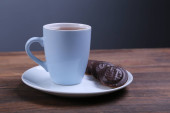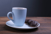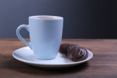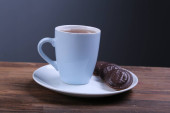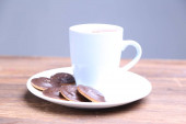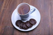 Obraz filiżanki herbaty z kości słoniowej z ciasteczkiem w kształcie serca.